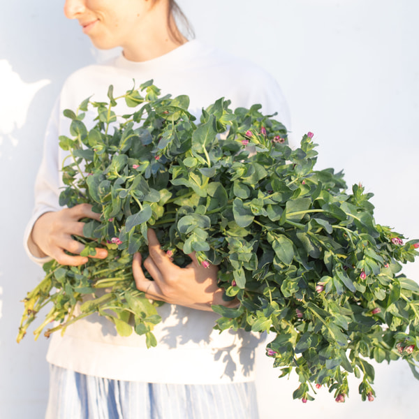 Endelig er denne skønhed også i vores sortiment. Vi opdagede voksurt for et par år siden, og siden da har vi haft den med i vores markplan hvert år. Det er en etårig, grønt i eukalyptus-farve med lilla spidser og blomster. Den sætter smukt frø og selvsår sig rigt.